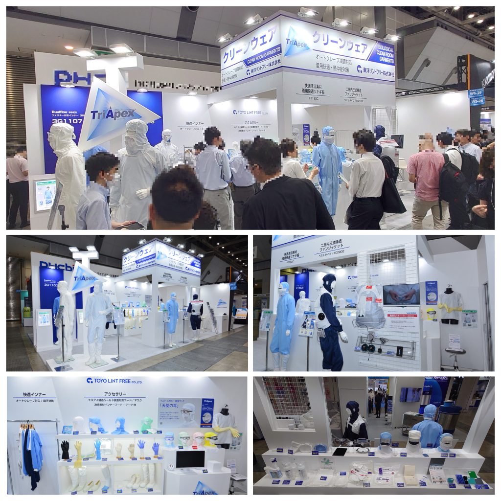 本展示会では、 股下ファスナーによる GMPグレードA・B向けのオーバーガウニングのご提案をはじめ、 オートクレーブ滅菌対応のクリーンウェア/インナー、 熱中症対策にも有効な特許取得構造のEF(電動ファン)装着対応ウェア、同じく特許を取得した独自構造のマスク・メガネ一体型フック「天使の耳」付きフード、吸汗速乾性に優れた快適ツナギ服/インナー、ガンマ線滅菌済みのタイベック製ディスポーザブルウェア、モスアイ構造シールド対応の眉毛・まつ毛脱落防止対策フード/マスク、ほか多数の製品をご紹介させていただきました。