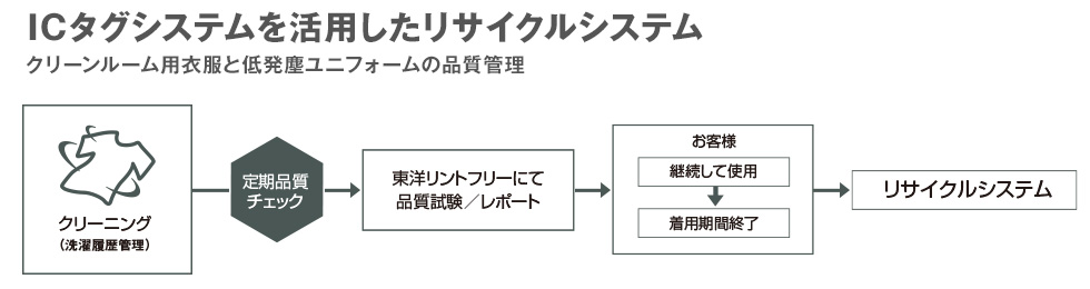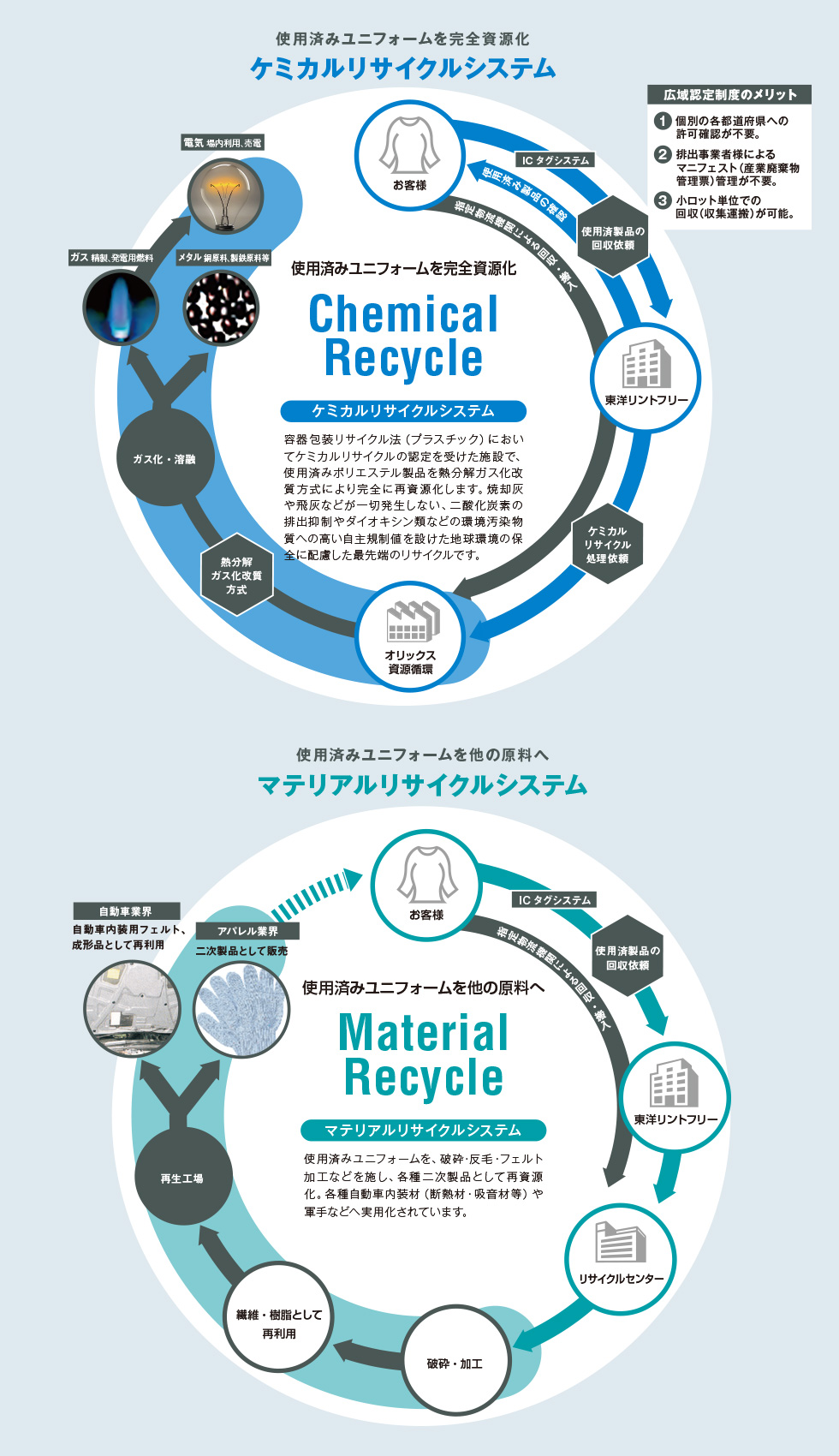 東洋リントフリーのリサイクルシステムでは、産業廃棄物取り扱いにおける法規制を完全に遵守した「広域認定制度」(環境大臣認定)によるリサイクルシステムにより、使用済みユニフォームのリサイクルを推進しています。